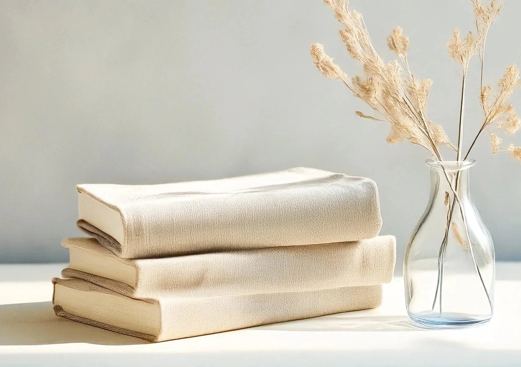 A glass vase with dried beige pampas grass next to three folded beige fabric napkins on a white surface with a neutral background.
