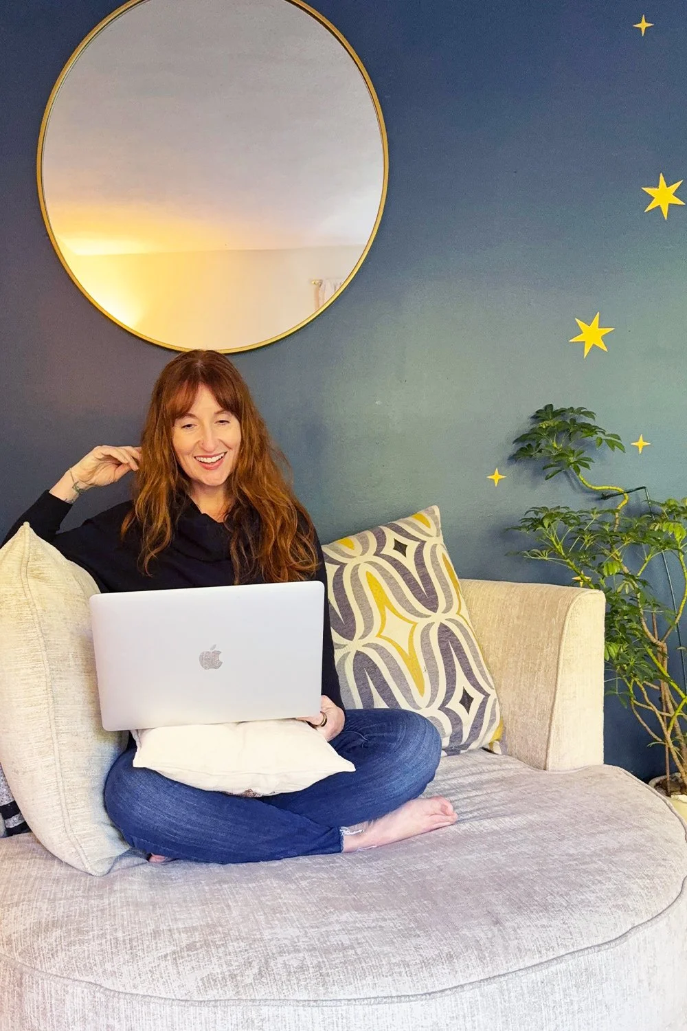 A woman with red hair smiling while sitting cross-legged on a beige couch, using a silver MacBook laptop, with decorative pillows and a potted plant nearby, and a mirror and star-shaped wall decorations on a blue wall in the background.