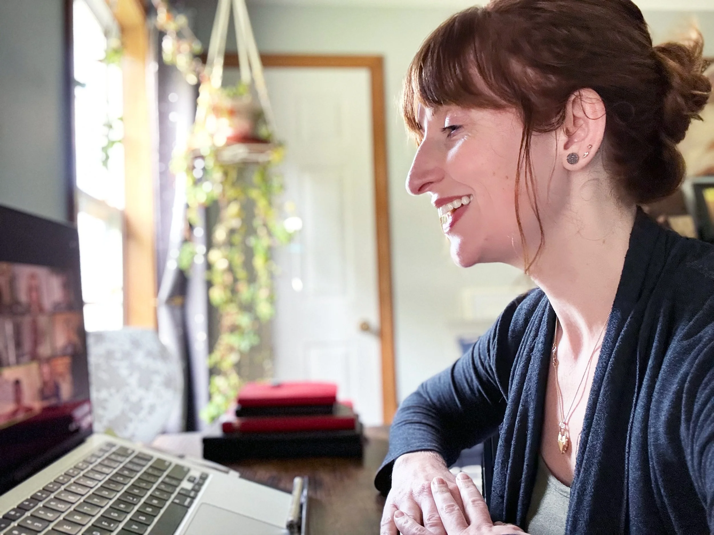 A woman with brown hair tied back, wearing earrings and a necklace, smiling while looking at her laptop in a well-lit room with a window and houseplants in the background.